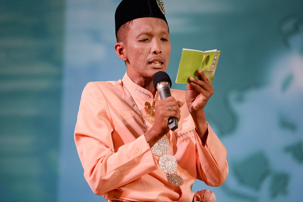 After the performance, Muhd DzulKilli takes out a booklet of Jing Si Aphorism and reads out one of the sentences: “When we view the world from a different perspective, the world becomes vast and wide. If we shift our perspective in everything we do, we will feel at ease with everything and everyone.” (Photo by Chai Yu Leong)