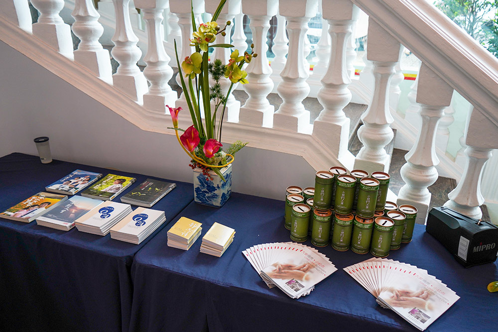 Several items are on display at the exit to facilitate the introduction of Tzu Chi as a voluntary organisation to the employees. The items include a few bamboo coin banks and bilingual Jing Si Aphorisms booklets all arranged neatly in a row.