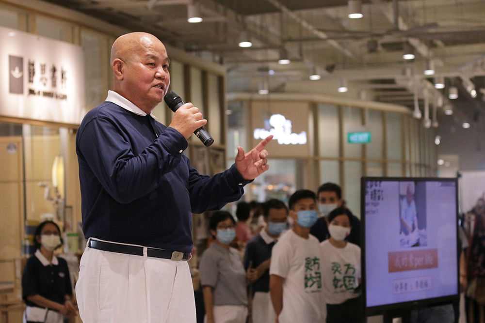 Lee Teck Hock often assists Tzu Chi with carrying and moving supplies. After becoming a vegetarian, he still has the same strength to carry out the physically demanding chore. He is seen standing on the centre stage, appealing to the audience to be animal saviours together. (Photo by Chua Teong Seng)