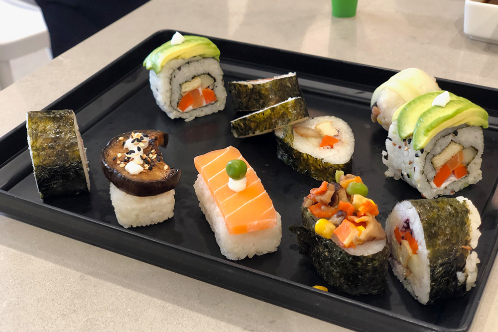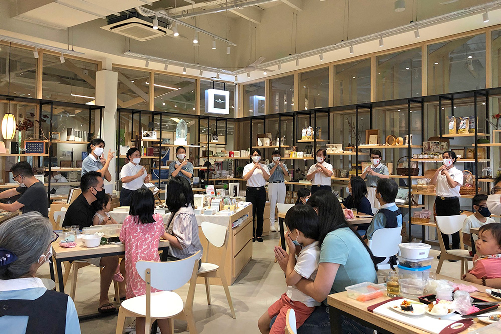 On this day, the coffee tables at Jing Si Books & Café (Yishun) were filled with Jing Si instant rice, seaweed, beancurd skin, vegetarian salmon, cucumber, etc. The ingredients alone were very tempting, fresh and vibrant. Parents and children were exuberant and enthusiastic with some saying, "Do you want a Mickey Mouse sushi? Shall daddy do it with you?" "Let’s cut this first, and then cut the long sushi..."