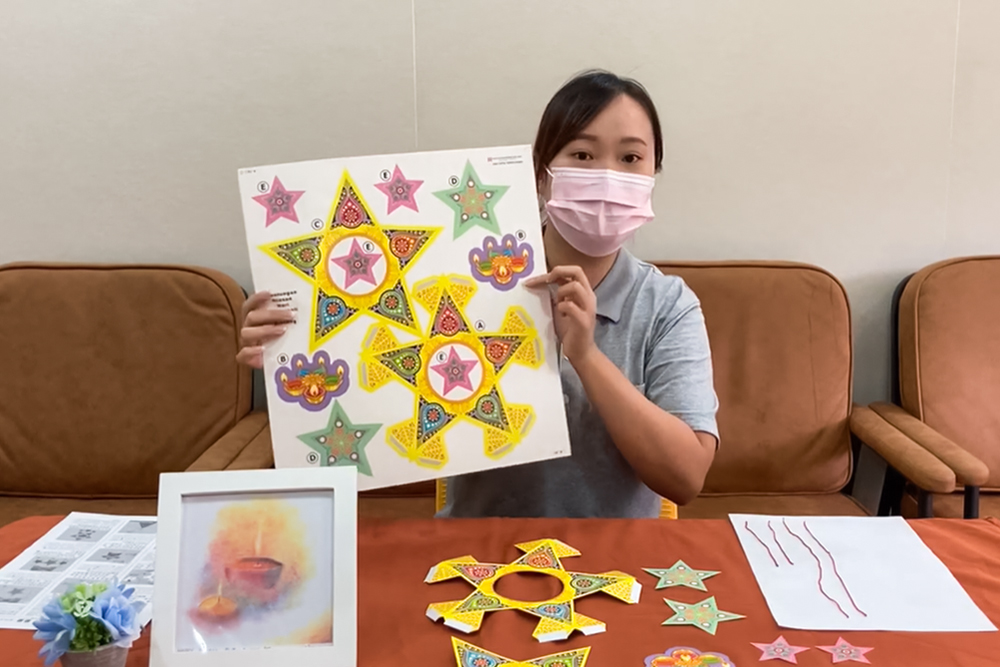 During the Deepavali celebration, Indian Hindus would light up small clay oil lamps, hang auspicious items and light decorations at home, and offer prayers to seek blessings in the coming year. This year, the production team added an extra activity to the programme, which was the making of light decorations, where the care recipients followed the instructor’s step-by-step demonstration online and made their light decorations. Although the steps were slightly complicated, everyone happily held up the lights to take a group photo after completing their artwork.