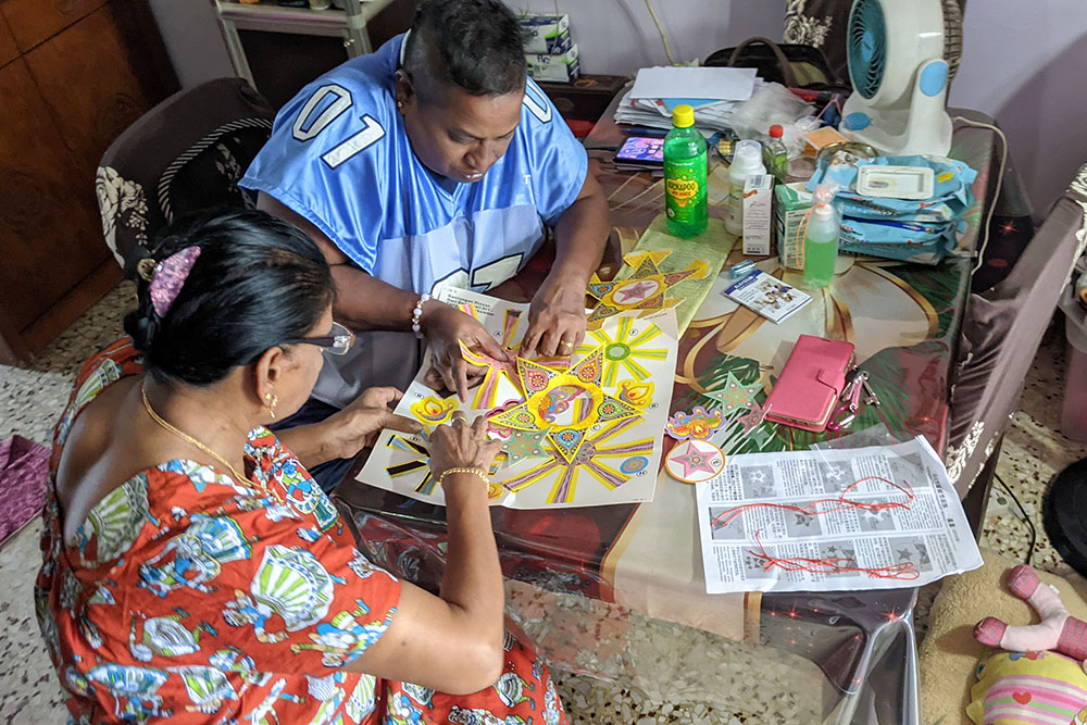 Care recipient Tiya (left) and her friend making the light decorations with the materials prepared by the staff. (Photo by Chong Kim Hong)