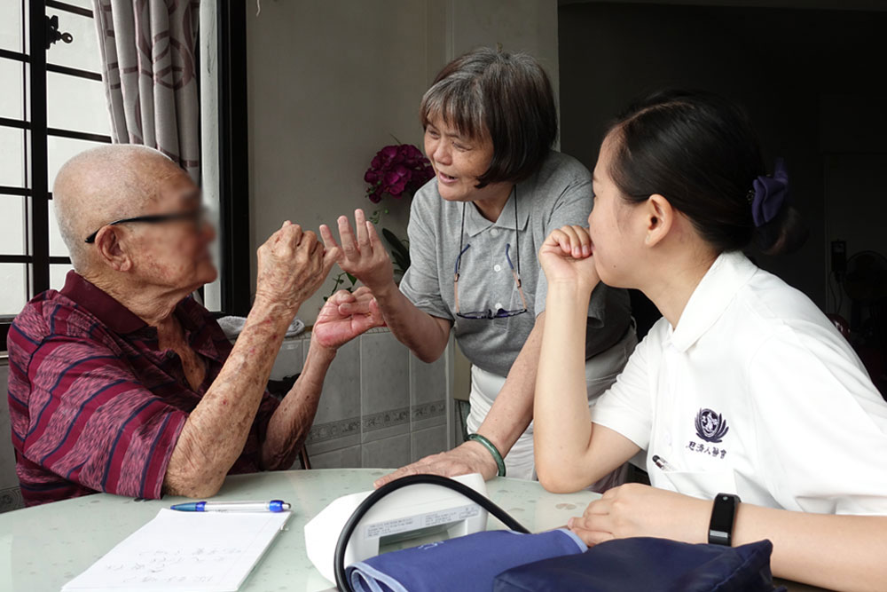 The home healthcare team visits Ngit Wah’s mother at least once a month to check on her health and listens patiently to Ngit Wah’s (right) feelings, thoughts and needs.