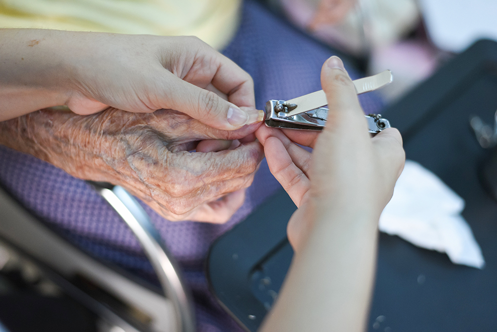 Nail trimming is an ordinary routine for the average person. However, for an elderly person with dementia, it requires some tactic and gentleness to coax the elderly into having his or her nails trimmed. (Photo by Wong Twee Hee)